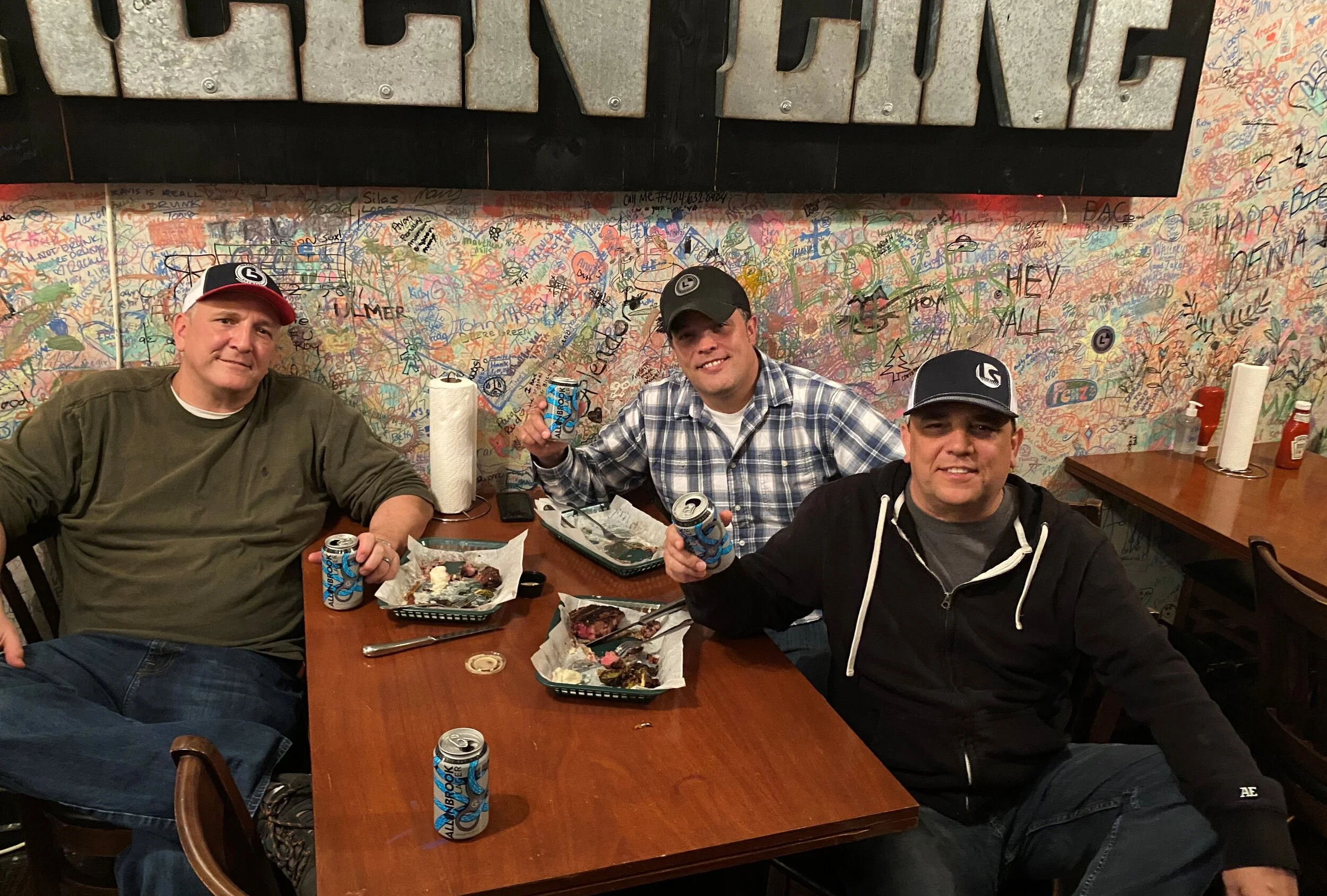 The collaborative atmosphere at Green Line Brewery has brought repeat customers back every weekend for the past six years, many of which are now like family. There is a television behind the bar, but unless the Dawgs are playing, it’s not always a definite to be turned on. People are too preoccupied soaking in the moments together, drinking tasty craft beer while listening to amazing live music from the local artists around Georgia. You may find a patron or two taking a marker to draw or write on a featured plastered wall in the brewery which was once white. Over the years this wall has taken on its own life and is now truly is a piece of art that represents the stories of their customers. It is filled with phrases, conspiracy theories, initials, doodles, songs, and more from the thousands of guests that have visited the brewery.
